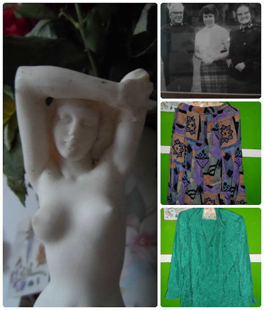 Those photos of you in your room are great. I love all the pictures and things behind your bed. I wish we had jumble sales here. You got some great stuff. I love the naked lady statue.